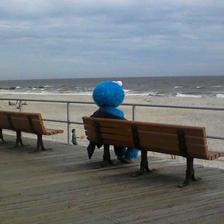 El Monstruo de las Galletas, vestido para la ocasión, sentado solo en la playa mirando al mar, con una pinta de estar filosofando sobre la vida.