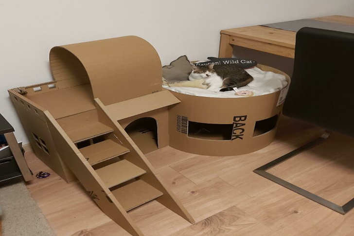 #18 Four Years Ago My Dad Said That He Would Not Take Care Of That Cat If We Get It. Now He Builds Guppy In Hours Of Work A Cat Mansion Out Of Cardboard Boxes