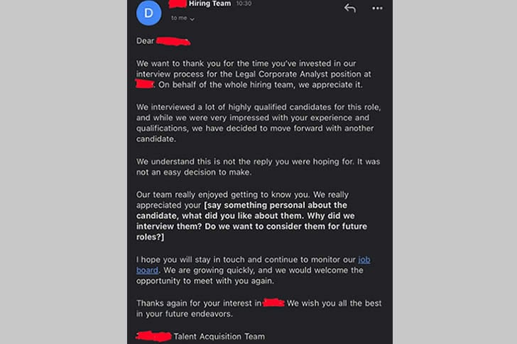 Gracias por considerar mi “empleo” en [ENTER COMPANY FOUND OFF OF JOB SEARCH SITE]. Fue un honor haber sido considerado por [COMPANY] y espero ser tenido en cuenta para [POSITION] si surge la necesidad en el futuro.
