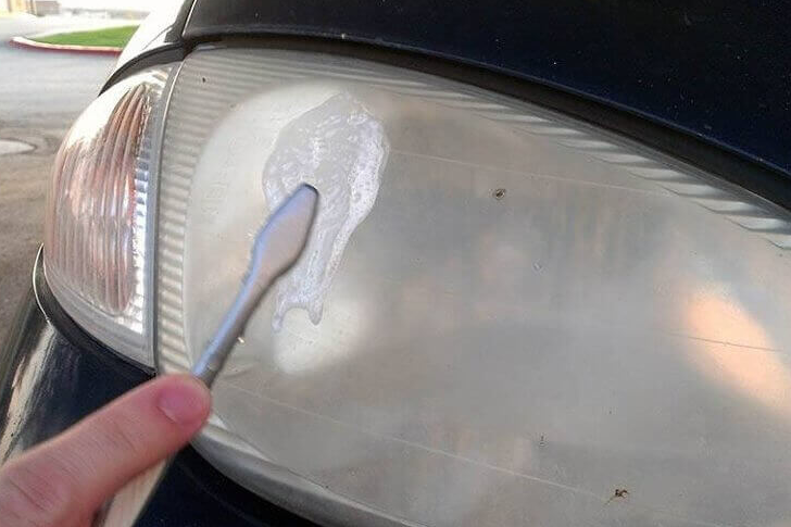 After washing your headlights with soap and water, apply a thin layer of whitening toothpaste to the headlight and then let it dry. Then, wipe it with a damp cloth for a few minutes to give it a good polish.