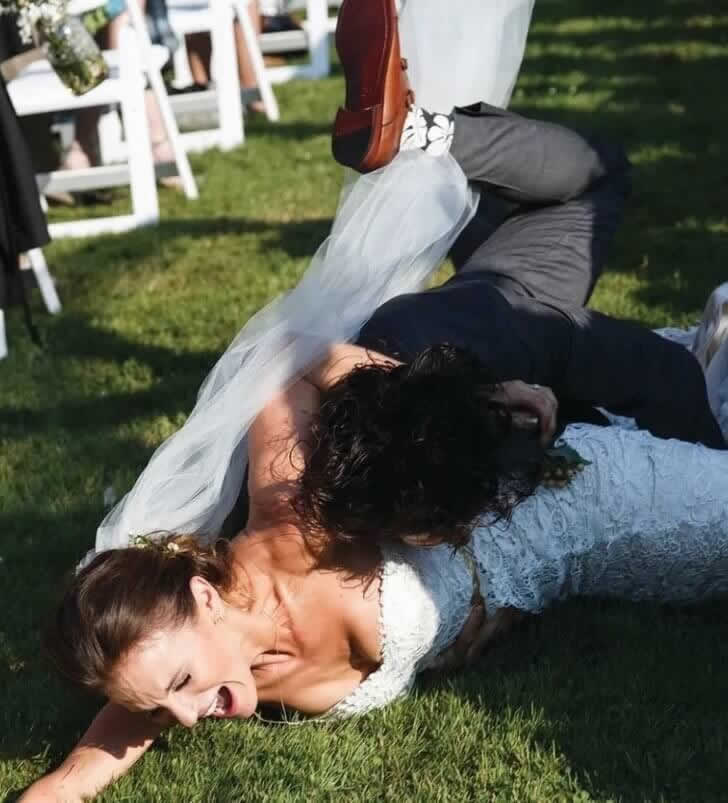 À primeira vista, parece um futebol americano pós-casamento. Mas olhe mais de perto — você verá que isso aconteceu no meio da cerimônia. Alguém levou um tombo, e a noiva acabou no chão, provavelmente se perguntando como ela foi de “Sim, aceito” para “ai” em menos de um segundo.
