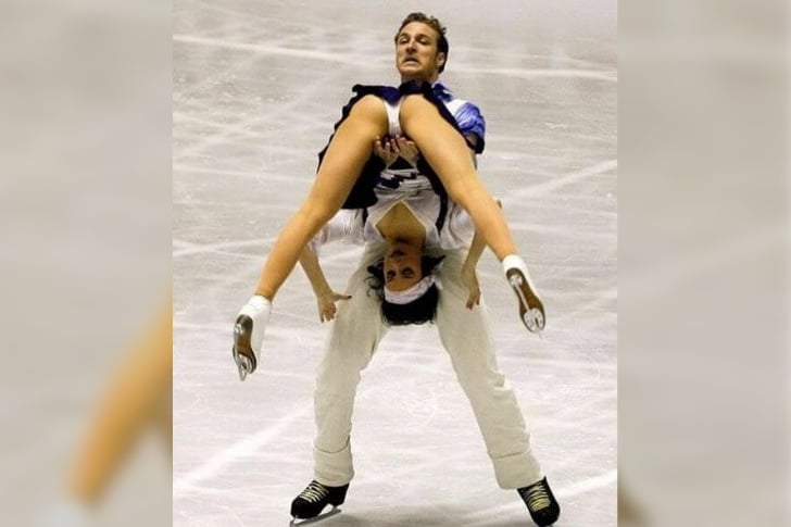 Este casal de patinadores estava se apresentando no auge de sua forma. Tudo estava indo maravilhosamente bem. Piruetas, saltos mortais, todos aqueles movimentos atléticos incríveis.
