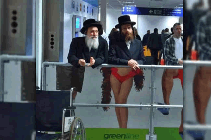 Na área de espera do aeroporto, dois cavalheiros estão despreocupadamente atrás de um poster, completamente alheios. No entanto, as pernas da atraente senhora no poster alinham-se perfeitamente com a postura da parte superior do corpo dos homens, transformando a imagem numa cena bem-humorada e ligeiramente atrevida.