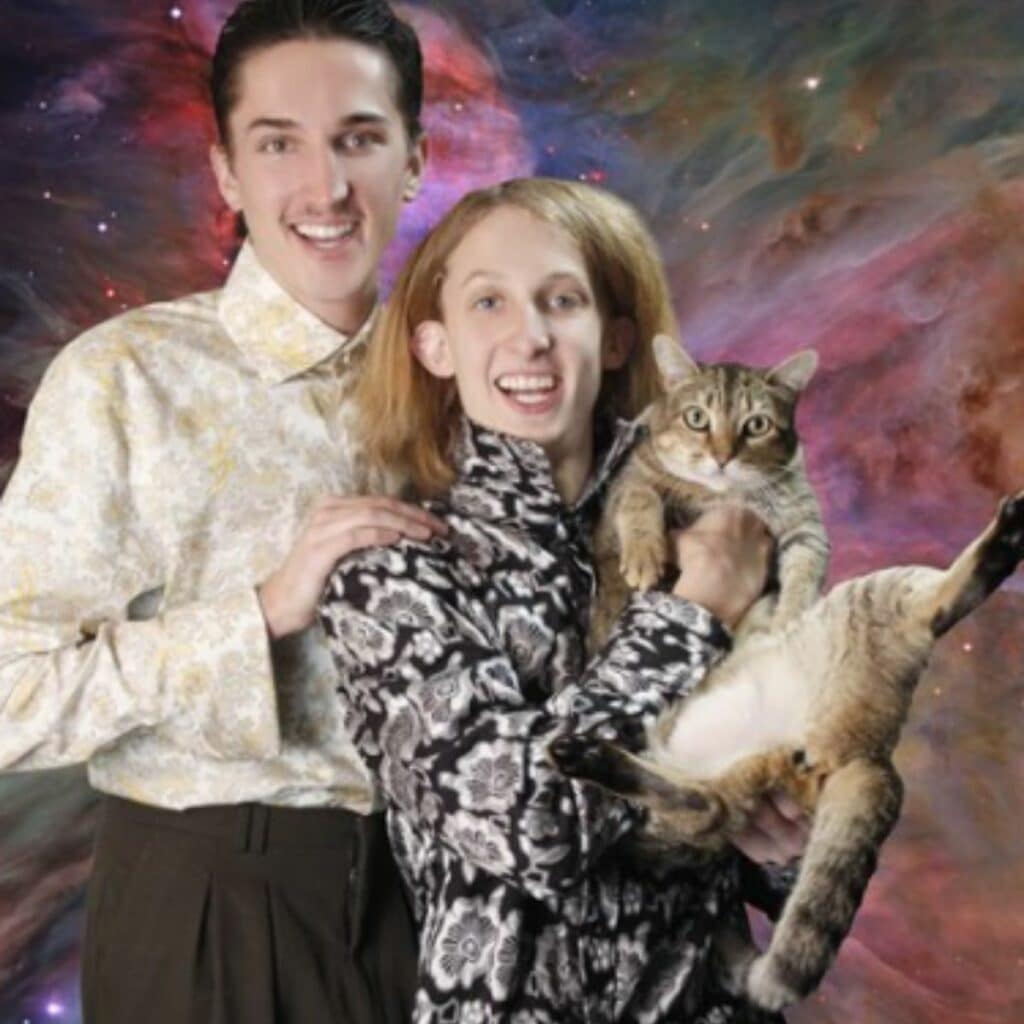 이 사진은 진정한 예술 작품입니다. 80년대 걸작에 고양이의 반전이 더해졌네요. 커플은 마치 아무도 신경 쓰지 않는다는 듯 은하계 80년대 의상을 완벽하게 소화하고 있고, 배경은 정말 환상적입니다.하지만 저 고양이에 대해 이야기해 봅시다. 시선을 강탈하네요!마치 스트리퍼처럼 뒷발을 벌리고 포즈를 취하고 있는 모습이 너무나 재미있습니다.