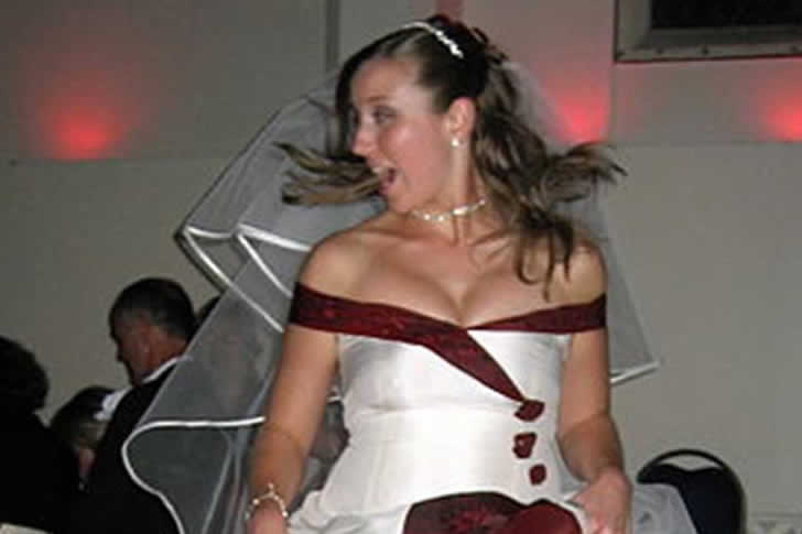 Je ne connais personne qui aime le marron au point d’en faire une partie de sa robe de mariée. Sauf peut-être cette fille. Bien que la coupe de la robe soit attrayante, ce horrible marron ruine toute chance que la robe soit à la mode. Et pourquoi y a-t-il une gigantesque découpe marron sur le devant de la jupe ?