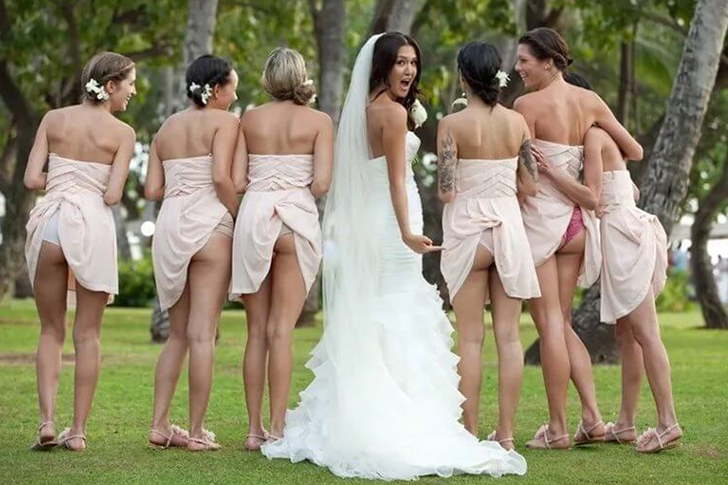 Espérons que le photographe n’a pas choisi cette image comme couverture de l’album de mariage, sinon les demoiselles d’honneur pourraient rougir d’effroi plus tard. La raison pour laquelle la mariée a opté pour cette pose reste un mystère. Mais après tout, c’est son jour, et qui oserait lui refuser une faveur ? Le groupe ressemble à une bande de meilleures amies, ce qui rend leur originalité un peu plus compréhensible.