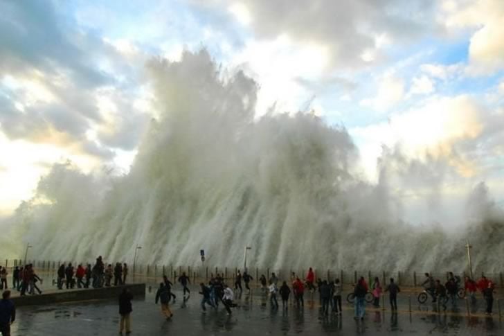 Il y a des échecs spectaculaires, et puis il y a ceux qui sont bibliques – et ce titan de marée appartient à cette dernière catégorie. Dans ce qui ressemble à un après-midi parfaitement paisible au bord de la mer, une vague massive s’écrase sur la barrière avec la colère de Poséidon lui-même, à quelques instants de tremper une foule sans méfiance. Des dizaines de personnes se dispersent dans toutes les directions, certaines figées d’admiration, d’autres déjà en pleine course, leur cerveau ne réalisant que maintenant qu’elles sont sur le point d’être trempées – ou pire.