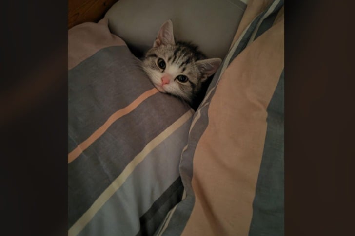 #23 Mon chaton qui jette un coup d’œil comme un tout petit bébé sous les couvertures