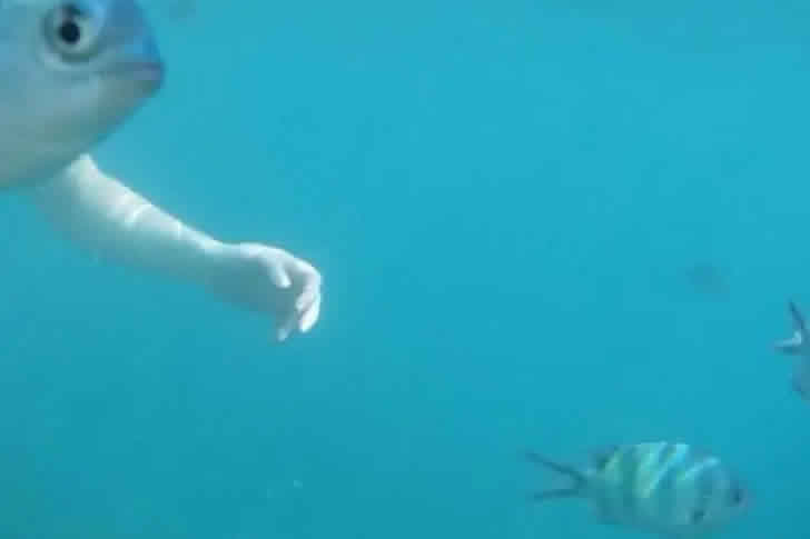 海中で撮影されたこの写真は、思わず二度見してしまう完璧なタイミングが魅力です。ダイバーの腕と泳ぐ魚が絶妙に重なり、まるで魚が人間の手を持っているかのような瞬間が捉えられています。青く澄んだ海の中で、魚の顔と人の腕が織りなすユーモラスな錯覚が、驚きと笑いを誘います。遠くを泳ぐ小さな魚たちと透き通った水が、神秘的な海底の雰囲気を演出する中、この一瞬が日常のダイビングを特別なものに変える魔法のような一枚です。