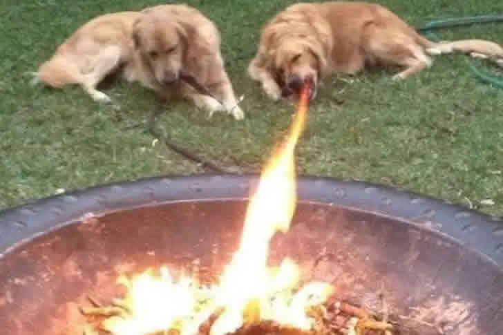 庭で撮影されたこの写真は、思わず二度見してしまう完璧なタイミングが印象的です。焚き火の前に寝そべる二匹の犬のうち、一匹が口から炎を吹いているかのような瞬間が捉えられています。焚き火の炎が犬の口元と一直線に重なり、まるで犬が火を吹くドラゴンのようなユーモラスな錯覚が生まれました。緑の芝生と穏やかな庭の雰囲気が、日常的なシーンを一瞬にして驚きの場面に変えます。この偶然のタイミングが、平凡なひとときを特別なものに変える魔法のような一枚です。