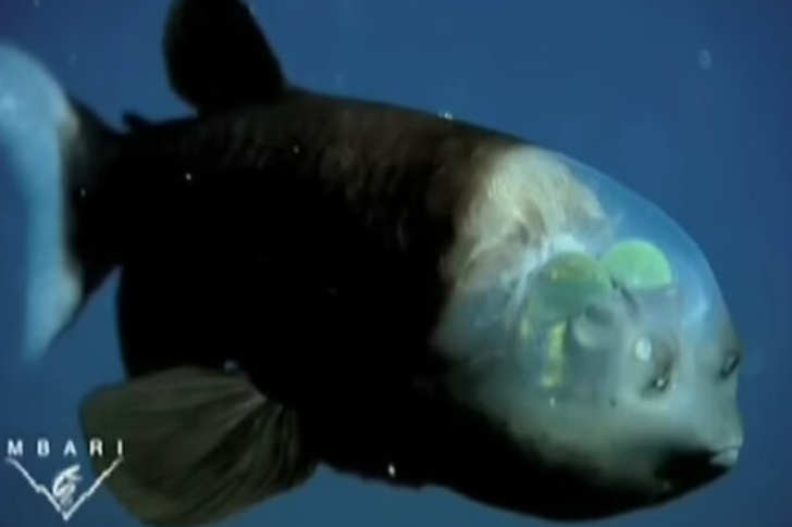 Pour la première fois, un grand poisson-barillet du Pacifique – doté d’une tête transparente – a été filmé par des scientifiques utilisant des véhicules sous-marins télécommandés à l’Institut de recherche de l’aquarium de la baie de Monterey. Les yeux tubulaires de ce poisson des profondeurs pivotent sous un dôme transparent.