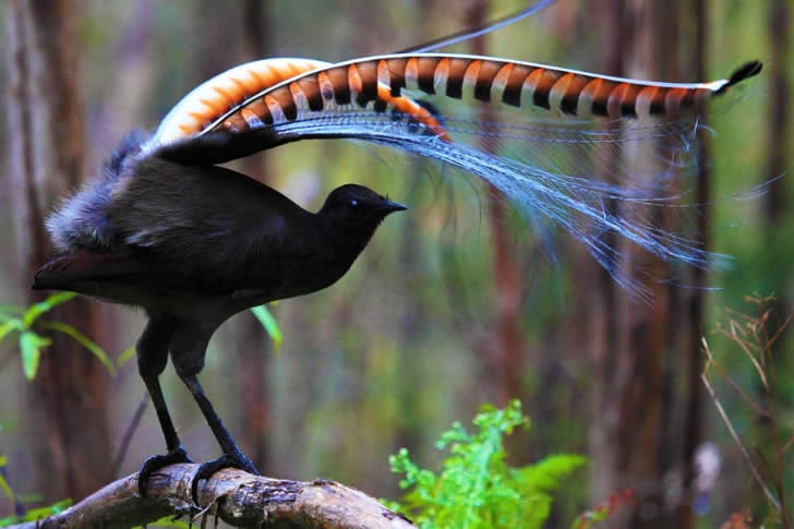 The superb lyrebird is a chicken-sized Australian songbird with ornate tail feathers shaped like a lyre harp. It scurries through the leaf litter of eucalyptus forests, rarely flying far.