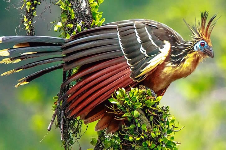 The hoatzin is a chunky, pheasant-sized bird with a spiky crest, bright blue face, and reddish-brown feathers. It lives in the swamps and riverine forests of the Amazon. Chicks have two claws on each wing that they lose as adults.