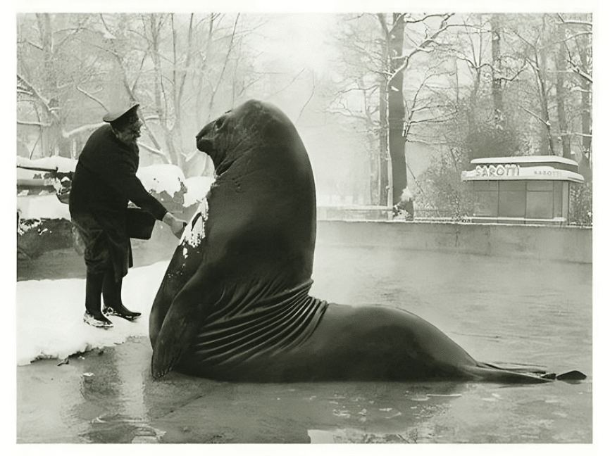 Techniquement, je suppose qu’il n’y a rien de vraiment remarquable dans cette photo au sens historique. C’est si vous considérez un éléphant de mer de 4 000 livres recevant un bain de neige comme n’étant pas remarquable.Je suppose que c’est quelque chose que vous ne verriez probablement pas dans de nombreux zoos modernes. Cela ressemble juste à une personne qui parle à un éléphant de mer dans la rue.
