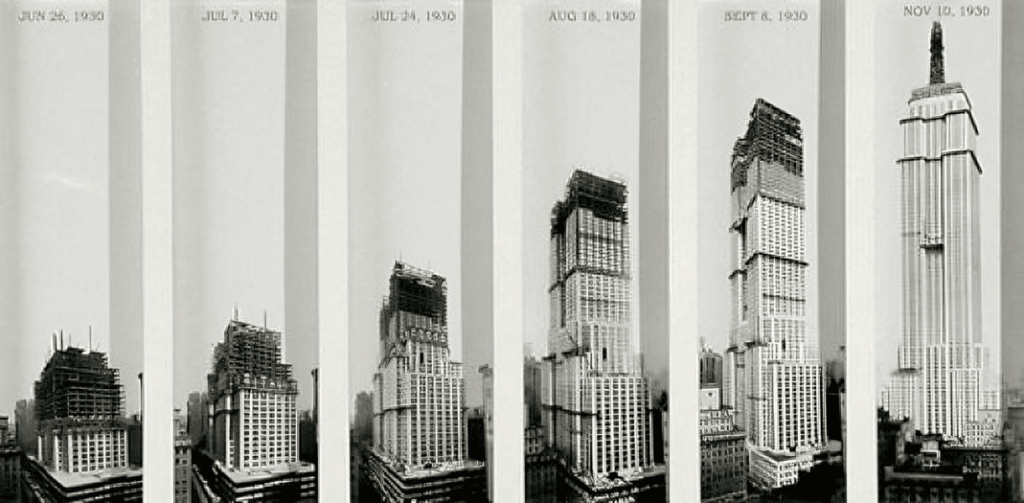 C’est particulièrement évident dans cette série de photographies illustrant la rapidité avec laquelle l’Empire State Building a été construit. **Si vous ne le distinguez pas très bien, les légendes en haut indiquent des dates de juin à novembre 1930.** Le tout a été construit en moins d’un an et en dessous du budget, un fait extrêmement rare aujourd’hui.