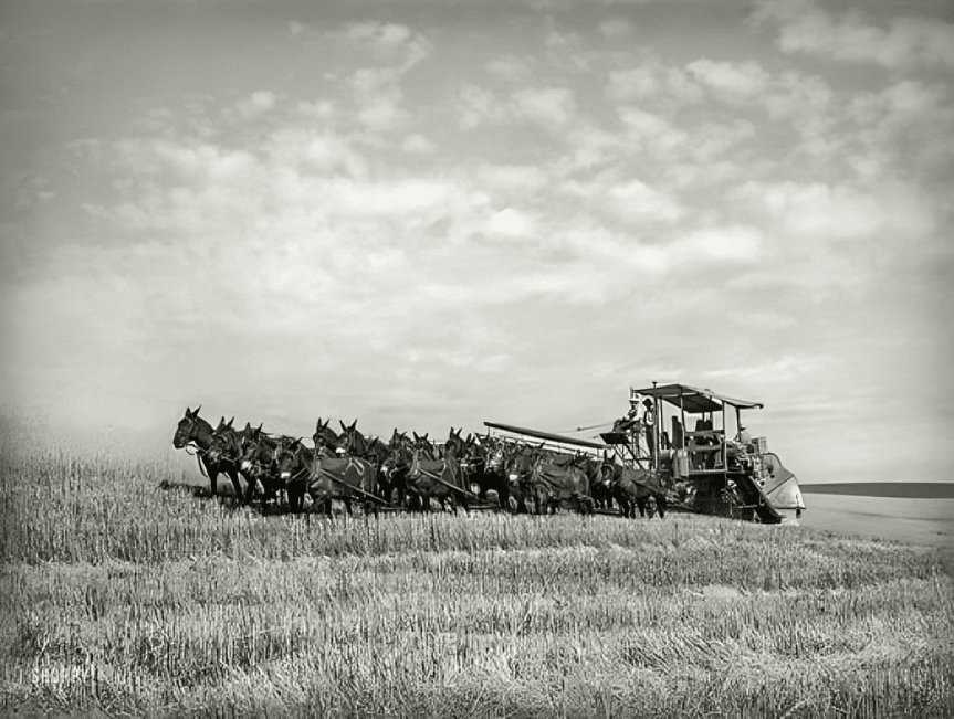 Ce qui est vraiment intéressant avec la technologie et le progrès, c’est que l’invention de divers outils qui facilitent toutes sortes d’activités humaines n’est pas exactement linéaire. Par exemple, sur cette photo de Washington en 1941,nous voyons une moissonneuse-batteuse tirée par vingt mules, utilisée pour récolter une sorte de culture.