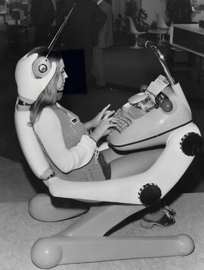 Voici une image du passé qui semble tout droit venue du futur. En fait, elle incarne une esthétique très spécifique desannées 1970 qui visait à capturer ce look futuriste tout en utilisant les technologies disponibles, dans ce cas, l’humble fauteuil, une machine à écrire, un casque audio et une lampe.