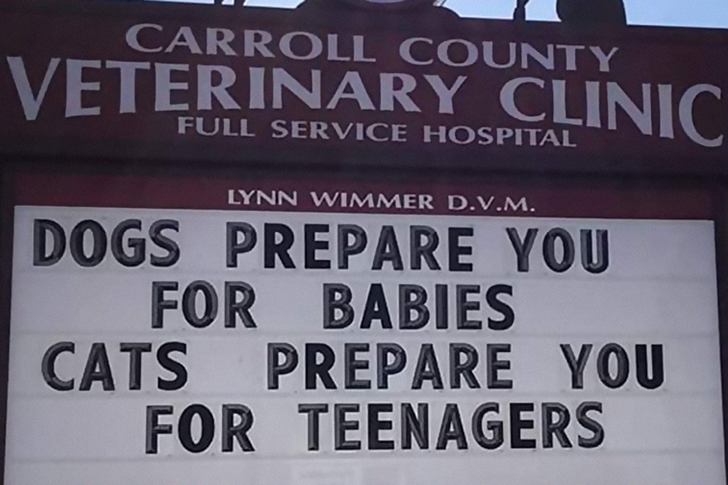 Si vous souhaitez augmenter l’affluence à votre clinique vétérinaire, considérez cette pancarte astucieuse. Elle affirme que les chiens préparent les gens aux bébés, tandis que les chats préparent les parents aux adolescents. Les chiens sont merveilleux, ressemblant à de grands bébés maladroits, ce qui fait partie de leur charme. Les chats, en revanche, sont une tout autre histoire. Ils peuvent être lunatiques et asociaux, tout comme les adolescents typiques.