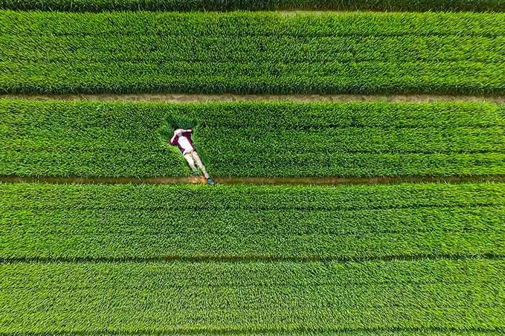 La photo ci-dessous montre un homme allongé dans l’herbe en train de se reposer. Il est peut-être inconscient, mais le fait qu’il se couvre les yeux avec sa main suggère qu’il est simplement fatigué de travailler et qu’il se repose. Cependant, il serait préférable qu’il trouve de l’ombre plus tôt pour éviter la déshydratation et les coups de soleil.