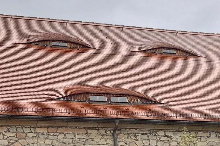 On connaît tous la célèbre chanson de Céline Dion, “Si les murs pouvaient parler…”. Mais dans ce cas, ne devrait-on pas plutôt dire “Si les toits pouvaient parler…” ? Car ce toit-là a certainement beaucoup de choses à raconter. On dirait qu’il est sur le point de prendre la parole. Mais son expression, plutôt sinistre, ne laisse présager rien de bon. Il est un peu dommage que ce mignon (?) visage de toit n’ait pas de nez.