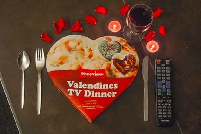 Inúmeras pessoas passam o dia 14 de fevereiro sem um parceiro. Se você se encontra sozinho este ano, pode estar procurando maneiras de tornar a noite um pouco mais festiva. Chegou a janta congelada com tema de feriado. É a mesma comida de micro-ondas que você geralmente come, mas vem em uma bandeja em formato de coração. É um pequeno consolo para uma noite solitária.