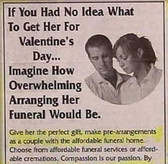 Encontrar o presente certo para o cônjuge é uma tarefa de alta pressão. No entanto, se seguisse o conselho deste anúncio de jornal específico, o seu casamento poderia estar acabado. Uma agência funerária local decidiu fazer uma promoção de Dia dos Namorados para caixões e jazigos. “Até que a morte nos separe” é um voto, mas ninguém quer fazer compras para isso num feriado!