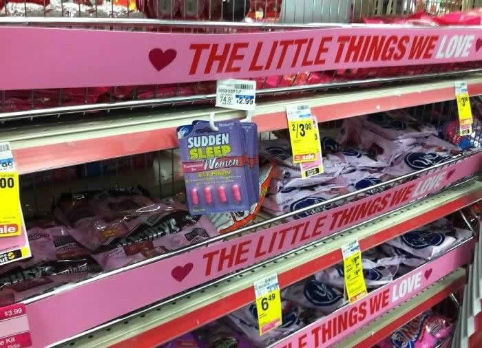Todos já ouvimos histórias de terror sobre encontros ruins, e a segurança é uma grande preocupação para muitas mulheres. Elas são constantemente lembradas de ficarem atentas às suas bebidas e de permanecerem alertas. Essa exibição de loja não ajuda a aliviar esses medos. Bem ao lado dos cartões de Dia dos Namorados, eles estocaram medicamentos de “sono de ação rápida”.