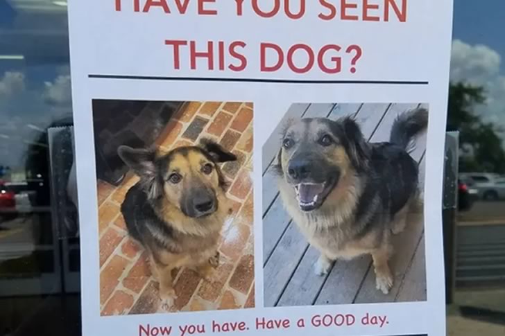 This photo starts out like a heart-tugging lost-dog poster—until you actually read it. Instead of sadness, you’re met with an unexpected burst of joy. This cheeky sign isn’t asking for help; it’s just spreading smiles by sharing a picture of a particularly photogenic pup. And it works!