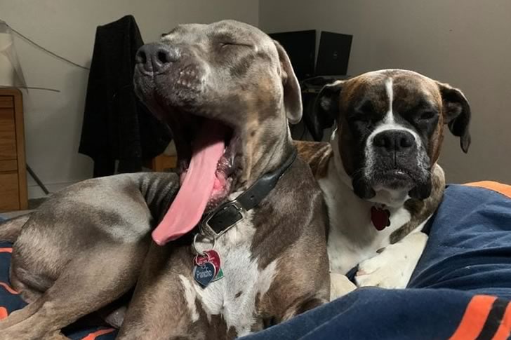 This image of the dogs napping together offers a serene escape from a busy day. The yawn and calm pose together create a funny yet comforting sight, lifting your mood effortlessly. It’s an ideal moment to unwind and smile.