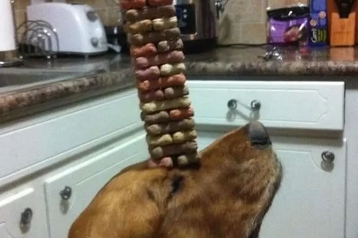 This photo deserves a round of applause. Imagine being told to sit still while someone balances a mountain of your favorite treats on your head—and then having to wait patiently for a photo. That’s exactly what this good-natured dog did, showing off next-level self-control and trust in his humans.