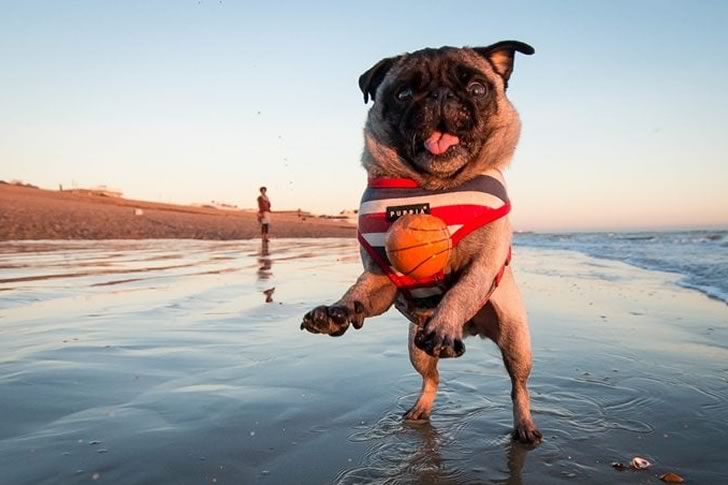 The pug’s playful jump with the ball brings a burst of laughter and energy to any day. Its happy expression and the beach backdrop make it a perfect scene to feel uplifted. This image is a fantastic way to add some fun and brightness to your routine.