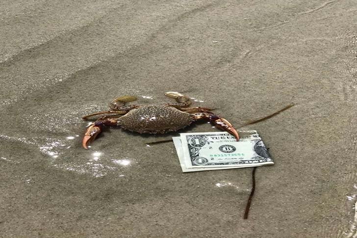 This crab looks like it’s making some sort of deal with a human. Maybe the crab’s thinking, “Take my money and find me a decent crab partner.”
