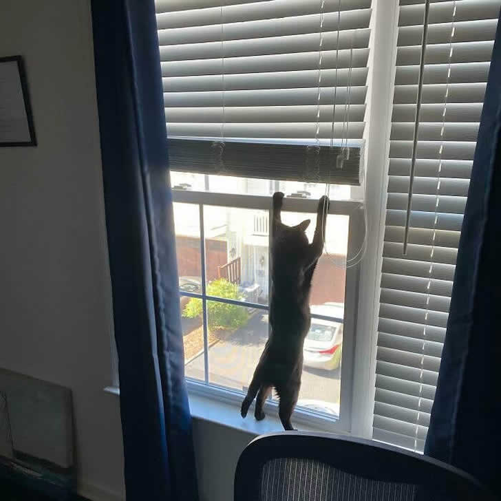 Con le zampe alzate ad afferrare il telaio della finestra, questo gatto non si nasconde affatto. Non è chiaro cosa sia così interessante, ma questo gatto non si muoverà finché non avrà le sue risposte.