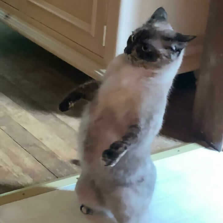 Quando un gatto si alza in piedi, c’è qualcosa di leggermente inquietante. Diventano improvvisamente più alti, più intelligenti e più cospiratori. Questo siamese si erge sulle zampe posteriori, con le braccia leggermente sollevate, pronto per una lotta o forse per un monologo drammatico.