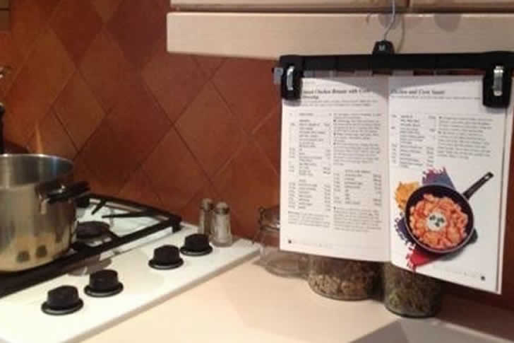 Klemmen Sie Ihr Rezeptbuch (oder das ausgedruckte Rezept) in den Kleiderbügel und hängen Sie es auf Augenhöhe auf – ein Schrankgriff, ein Schubladenknopf oder alles andere, was baumelt, tut es auch. Nie wieder Seiten mit klebrigen Fingern umblättern oder versuchen, auf soßenbefleckte Anweisungen zu schielen. Ihr Kleiderbügel hat gerade den Abschluss zum Sous-Chef gemacht.
