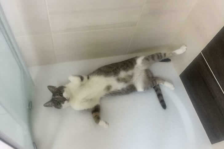 And then, tragedy strikes. The human, without so much as a knock, flings open the shower door. The cat, caught mid-lounge, looks up with a glare that says, “How dare you?” as if the invasion of privacy were a personal betrayal. This wasn’t just a cat napping in a weird spot—this was a sacred, private ritual, shattered by one careless moment. Honestly, the only thing missing was a tiny towel wrapped around its head and a cucumber slice falling off one eye.