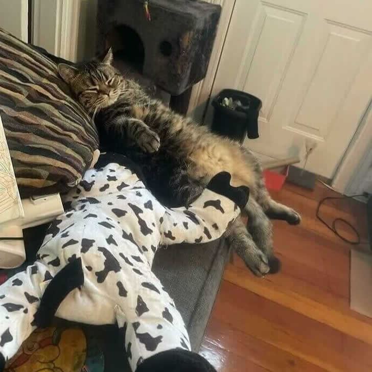 We give dogs all the flack when it comes to, let’s say, unfiltered enthusiasm, but cats? They’re no saints either. This particular feline has formed a rather intense relationship with his plush cow companion.