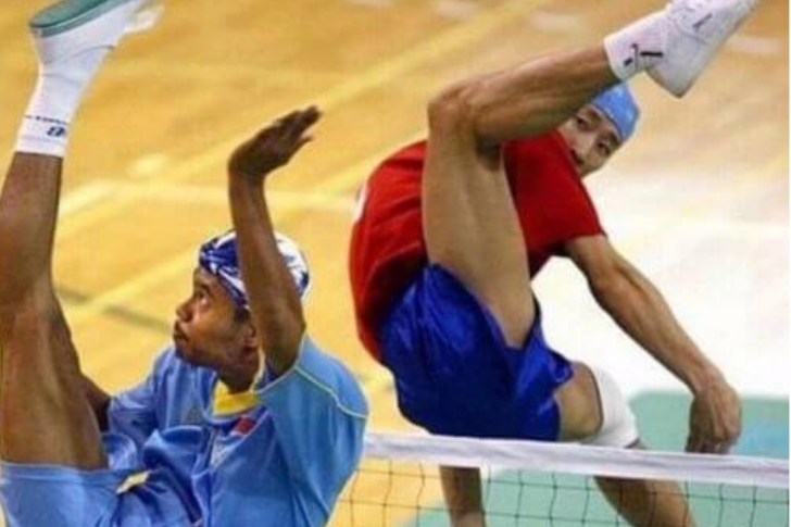 This gravity-defying footvolley moment has us questioning whether we’re watching a sport or an acrobatics routine! The attacker and defender have twisted their legs into what looks like a game of extreme Twister—with limbs pointing in directions that defy normal human anatomy. That mid-air scissor-kick? Pure rubber-band flexibility meets sheer determination.