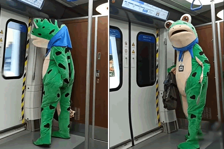 There was a real laugh riot on the Chinese subway today! A brave passenger showed up in a frog mascot outfit. Yes, you heard that right: a giant, green frog right in the middle of the carriage! People were quite astonished and couldn’t help but burst into laughter.