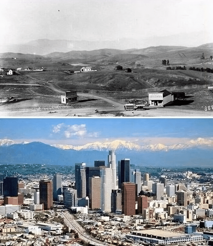 You probably recognize the city in the second photo as downtown Los Angeles, but do you recognize the city in the first one? That’s right; it’s downtown Los Angeles. Only 100 years separate these two photos; they look like they could have been taken in completely different places and parts of the world.