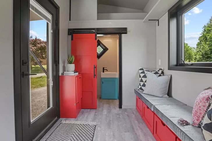 Step inside and you’re immediately greeted by a lively burst of color—bold reds dominate the interior, creating a vivid contrast with the vibrant blue and green tones outside. This energetic palette makes the living room feel playful and full of personality, a perfect place to unwind or welcome guests.