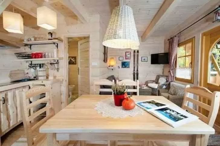 The dining area is an elegant combination of matching wooden tables and chairs, all blending seamlessly with the cabin’s natural tones. Overhead, rattan lighting adds texture and warmth, giving the room a cozy, unified look. The soft beige palette enhances the calm, welcoming feel.