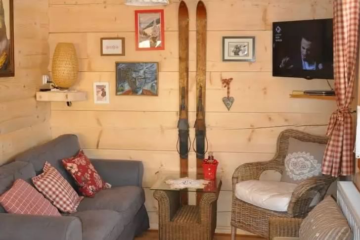 The living room pairs soft upholstered sofas with rattan accents, creating a blend of rustic and modern comfort. The natural wood walls make everything feel grounded, while the neutral colors bring an added sense of serenity. A few personal touches—like artwork or books—can make it your own.
