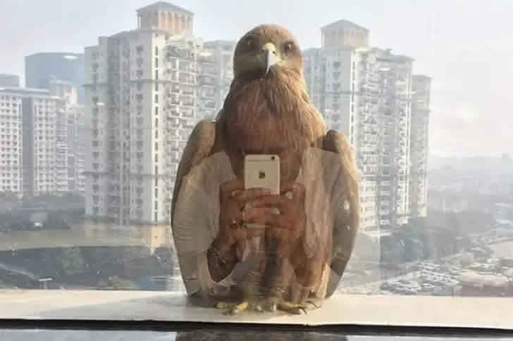Esta foto, tirada perto de uma janela, impressiona pelo timing perfeito que nos faz olhar duas vezes. A águia, majestosa do lado de fora da janela, foi flagrada em um momento que parece que ela está tirando uma selfie com um smartphone. A mão da pessoa refletida no vidro e a imagem da águia se sobrepõem de forma primorosa, criando uma ilusão hilária. Com os arranha-céus ao fundo criando uma atmosfera urbana, este instante provoca surpresa e risadas. Um momento casual como este transforma uma janela comum em algo mágico.