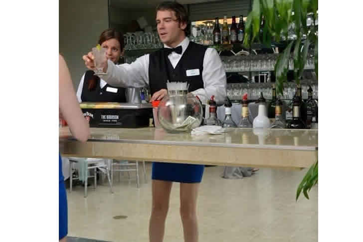 A imagem retrata, com muito humor, um barman servindo bebidas no balcão de um bar. Ele veste um elegante colete preto e gravata borboleta, mas o que chama a atenção é a sua combinação inesperada: ele está usando uma minissaia e saltos altos. Essa surpresa arranca um sorriso de qualquer um. Ao fundo, prateleiras repletas de garrafas indicam um ambiente de festa animada. No balcão, um grande jarro sugere que ele está preparando os drinks com cuidado. Este barman único certamente proporciona momentos de alegria e surpresa a quem o visita.