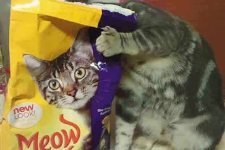 Esta imagem do gato simboliza o humor quotidiano que os animais de estimação trazem. A imagem dele a enfiar a cabeça no saco de ração reflete a curiosidade e a inocência do gato. Observar momentos como este traz um momento de paz no meio da azáfama do dia a dia. A pequena felicidade encontrada na vida com animais de estimação parece ser transmitida através desta imagem.