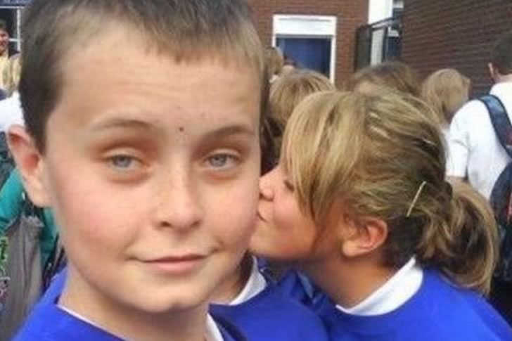 A boy takes a selfie outside a school, unaware as a girl sneaks a kiss on his cheek, her face pressed close with a mischievous grin. The brick building and crowd of students in blue uniforms add a lively backdrop, turning this candid moment into an unexpectedly bold and funny snapshot on this Tuesday morning of June 10, 2025.