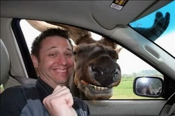 A man snaps a selfie inside a car, grinning as a moose sticks its head through the open window, its goofy face adding an unexpected twist. The green fields visible outside and the car’s interior create a funny contrast, turning a routine drive into an extreme and hilarious moment on this sunny Tuesday morning of June 10, 2025, at 11:30 AM HKT.