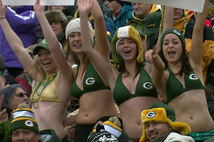 Mentre i Green Bay Packers fanno faville sul campo, queste quattro ragazze tra il pubblico dimostrano che la tenacia si manifesta anche resistendo al freddo. Mentre altri spettatori si rannicchiano in giacche invernali, loro sfoggiano solo top bikini e cappelli, nonostante il freddo sia palese.