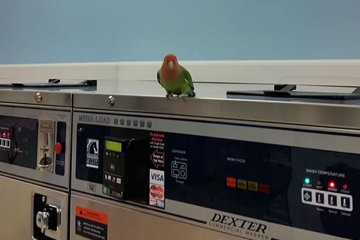 A prima vista, questa foto sembra una bizzarra pubblicità di una lavanderia, ma un secondo sguardo rivela qualcosa di deliziosamente inaspettato. Un vero uccello, identico per colore e postura a quello stampato nel poster sopra di esso, è posato casualmente su una lavatrice. La somiglianza e l’allineamento inquietanti fanno sembrare che l’uccello sia volato direttamente fuori dalla pubblicità e abbia deciso di aspettare che il suo ciclo di lavaggio finisca.